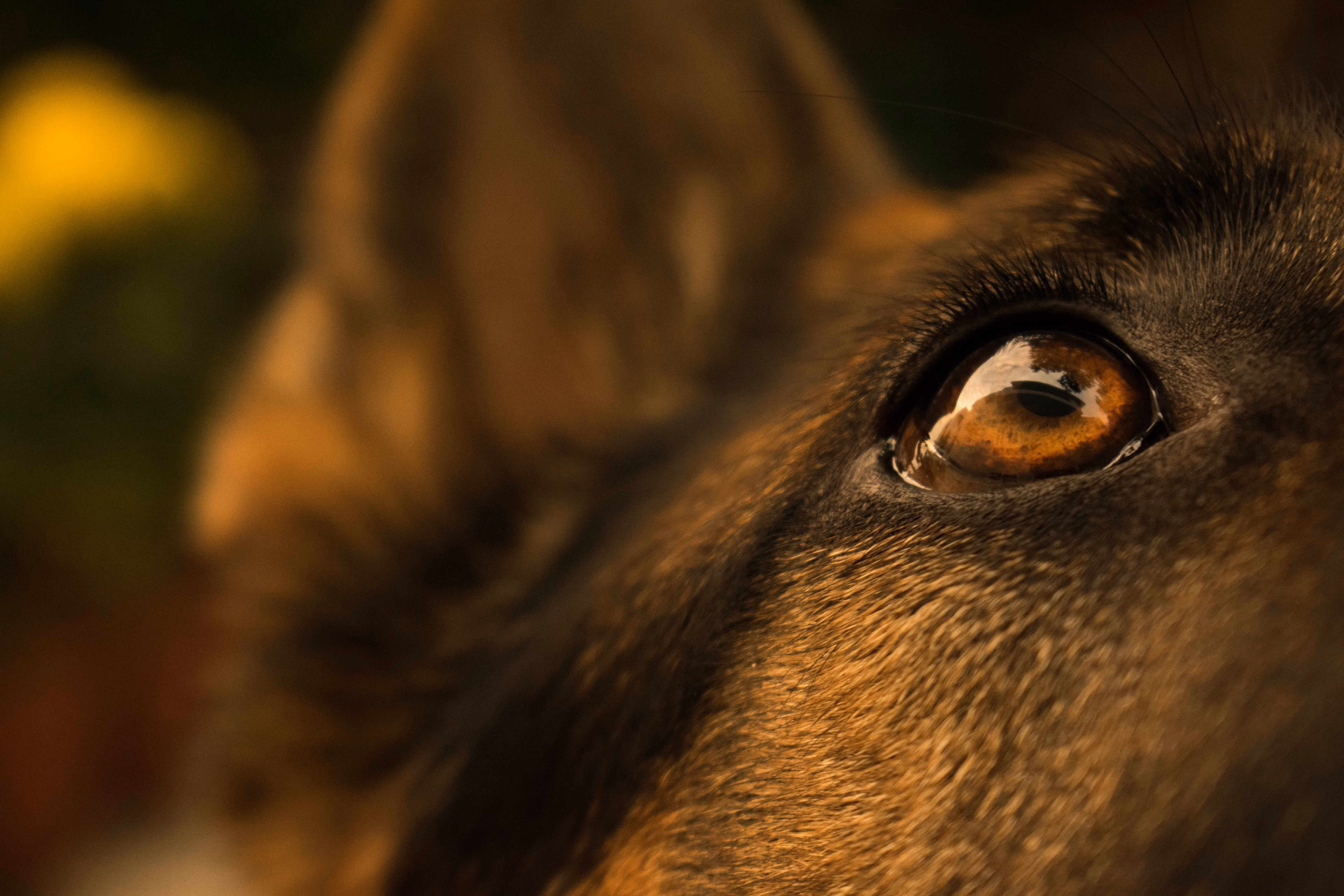 Lastly, dogs and cats have a layer of reflective cells behind their retinas called a tapetum lucidum. This layer acts as a mirror, reflecting light back into the eye and effectively giving dogs and cats a second chance to register what they’re seeing. And as a fun side note, the tapetum lucidum is also responsible for creating a greenish glow in a dog or cat’s eyes when a headlight or camera flash illuminates them at night. That is, unless those pets have blue eyes. Blue-eyed animals don’t have a tapetum, so their eyes will have a reddish glow (just humans have red-eye in flash photos).